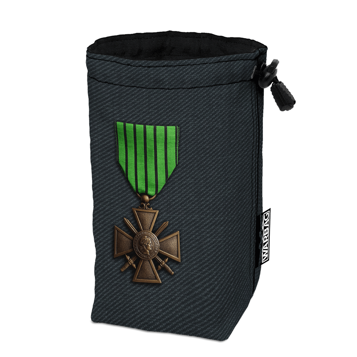 Las bolsas para dados BIGTOP “Francia 1940 Cruz de Guerra”, de formato tubular de WARBAG están 100% fabricadas en España por nosotros, con los mejores materiales para darle mucho cuerpo y resistencia a la bolsa. La sensación es de firmeza y tiene una gran capacidad para llevar tus dados. No es la típica bolsa fina y sin forma, las bolsas para dados de WARBAG están diseñadas para durar, proteger y lucir bien.