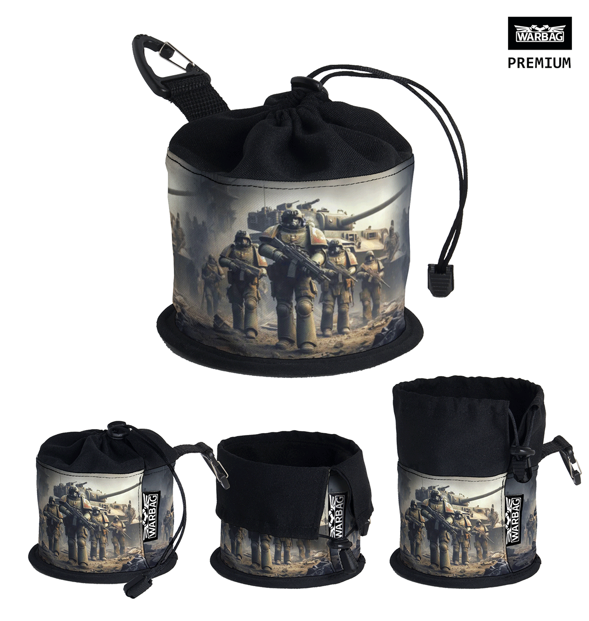 Las bolsas para dados PREMIUM “Tropas”, de formato tubular de WARBAG están 100% fabricadas en España por nosotros, con los mejores materiales para darle fiermeza estra y mucha resistencia a la bolsa. La sensación es de firmeza y tiene una gran capacidad para llevar tus dados. No es la típica bolsa fina y sin forma, las bolsas para dados de WARBAG están diseñadas para durar, proteger y lucir bien.